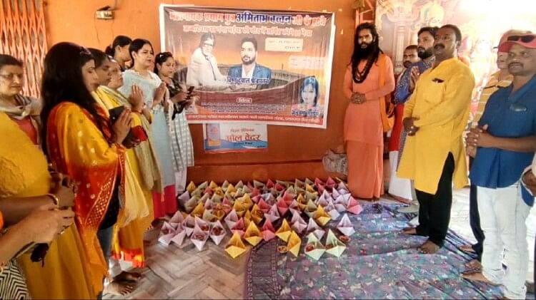 श्री बड़े हनुमान मंदिर पर महानायक अमिताभ बच्चन का जन्मदिन मनाते लोग।