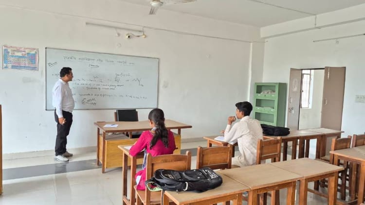 ग्राउंट फ्लोर के क्लास रूम के धूल में लिपटे बंद दरवाजे थे। एक क्लास में कुर्सी-मेज उल्टी करके रखी थीं। लैब पर भी कुंडी लगी थी। फर्स्ट फ्लोर पर सभी शिक्षक एक जगह बैठे थे। कुछ टीचर एक क्लास में थे। प्राचार्य डॉ. जयशंकर अपने कार्यालय में आवश्यक काम कर रहे थे। उनकी मेज पर भी कुछ जगह धूल थी। पूछने पर पता चला कि कोई नियमित चपरासी नहीं है। आउटसोर्सिंग से रखे दो कर्मचारी पूरे कॉलेज का काम देखते हैं।