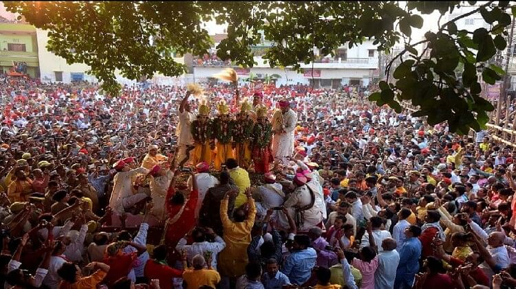 यादव बंधुओं ने कंधे पर उठाया पुष्पक विमान रूपी रथ