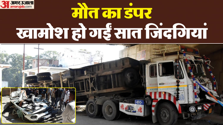 एक्सप्रेसवे पर हादसे के बाद कार पर पलटा पड़ा बजरी से भरा डंपर और क्षतिग्रस्त कार