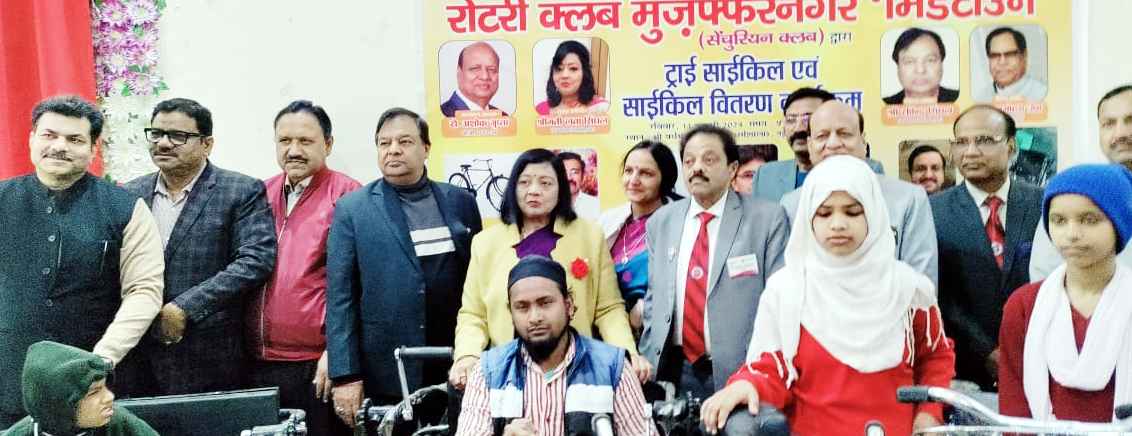 मुजफ्फरनगर।(Muzaffarnagar News)रोटरी क्लब मुजफ्फरनगर मिडटाउन (सेंचुरियन क्लब) द्वारा १२ ट्राई साइकिल एवं १३ साइकिल वितरण कार्यक्रम श्री वर्धमान जैन भवन (धर्मशाला) नई मंडी, मुजफ्फरनगर में किया गया
