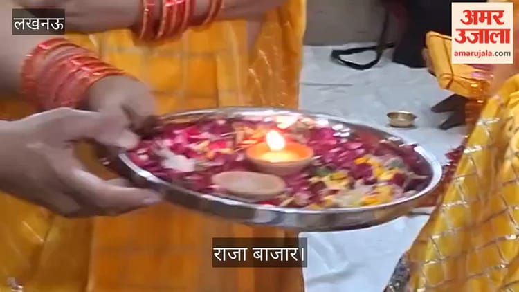 लखनऊ: राजा बाजार…गीताभवन में हरिश्चंद्र वंशीय महिला समिति की भगवत कथा, आरती करते भक्त