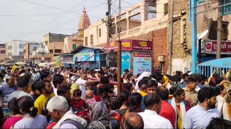 विद्यापीठ चौराहा पर भीड के बीच बांकेबिहारी मंदिर की ओर जाने के लिए मशक्कत करते श्रद्धालु।