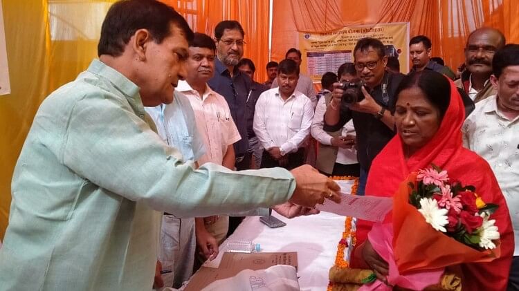 ब्याज माफी के बाद पहला पंजीकरण कराने वाली छावनी क्षेत्र निवासी मीरा बिजली का बिल सौंपते ऊर्जा मंत्री।