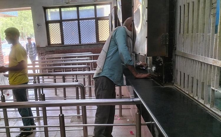 रेलवे स्टेशन टिकट काउंटर पर पूछताछ करते यात्री।