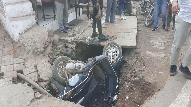 Agra: खुले नाले में गिरा स्कूटी सवार, लोगों ने निकाला बाहर