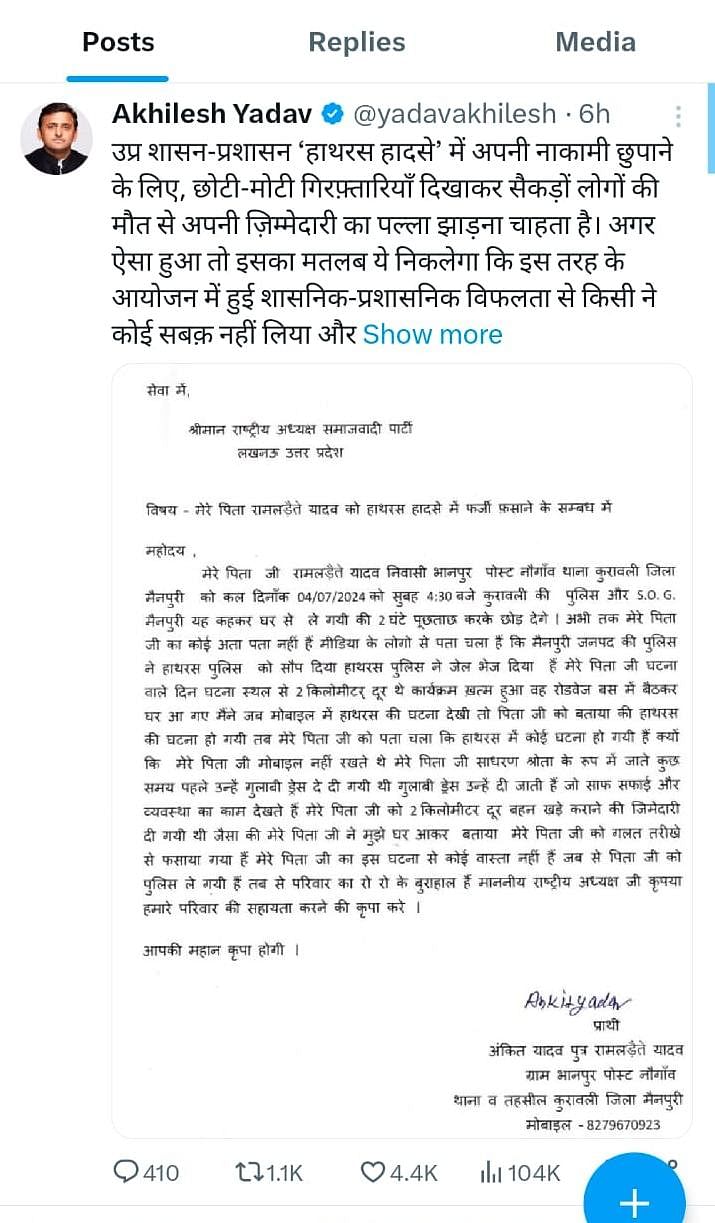 अंकित ने पत्र में लिखा है कि उसके पिता घटना वाले दिन घटनास्थल से दो किलोमीटर दूर थे। उसने बताया कि साफ-सफाई व अन्य व्यवस्था में लगे लोगों को ही गुलाबी वर्दी दी जाती है। उस दिन रामलड़ैते को दो किलोमीटर दूर वाहन खड़े कराने की जिम्मेदारी मिली थी। वे रोडवेज बस में बैठकर घर आ गए थे। जब जानकारी होने पर अंकित ने उन्हें हादसे की बात बताई तो उन्हें जानकारी हो सकी। इसके बाद भी पुलिस ने उन्हें झूठा फंसा दिया। सपा अध्यक्ष ने यही पत्र एक्स पर पोस्ट करते हुए गिरफ्तारियों पर सवाल खड़े किए हैं।