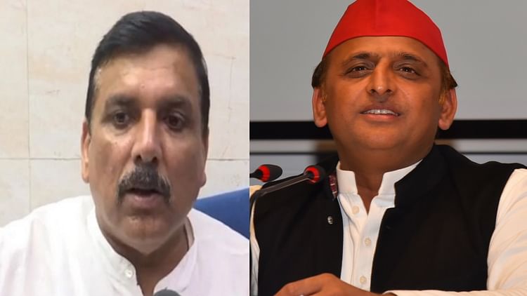 आप सांसद संजय सिंह व सपा अध्यक्ष अखिलेश यादव।