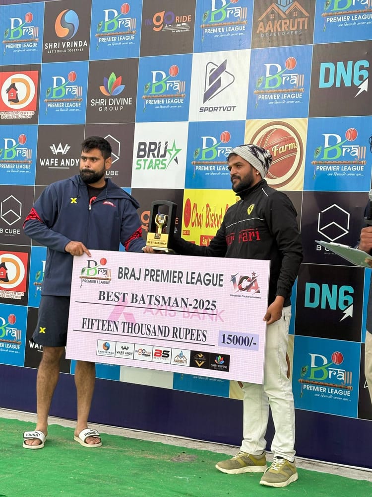 आगरा। वृंदावन में खेले गए ब्रज प्रीमियर लीग में आगरा के ऑलराउंडर अक्षत पांडे ने शानदार प्रदर्शन करते हुए टूर्नामेंट पर अपनी छाप छोड़ी। मैन ऑफ द टूर्नामेंट के लिए उन्हें 21 हजार रुपये जबकि बेस्ट बल्लेबाज बनने पर 15 हजार रुपये नकद पुरस्कार दिया गया। अक्षत इससे पहले भी बड़े मंचों पर अपनी प्रतिभा का लोहा मनवा चुके हैं। उन्होंने उत्तर प्रदेश प्रीमियर लीग और मुश्ताक अली ट्रॉफी में रेलवे टीम की ओर से खेलते हुए शानदार प्रदर्शन किया है।