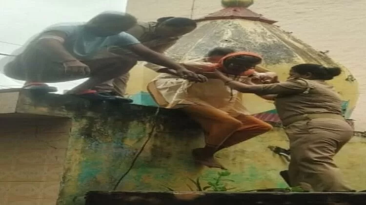 छत से कूदने का प्रयास करती प्रेमनाथ बाई को रोकती पुलिस