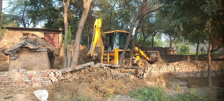 चहारदीवारी को तोड़ती जेसीबी