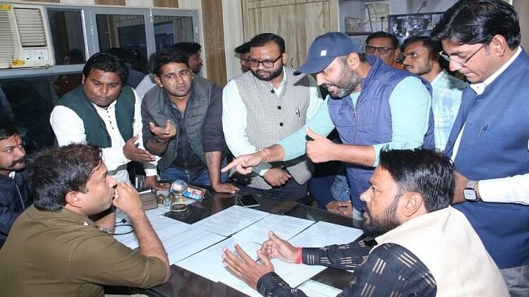 थाना बन्ना देवी में सीओ विशाल सिंह से वार्ता करते भाजपा पदाधिकारी