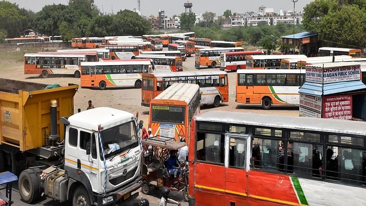 सारसौल रोडवेज वर्कशॉप पर हडताल के दौरान खड़ी रोडवेज बस – फोटो : संवाद