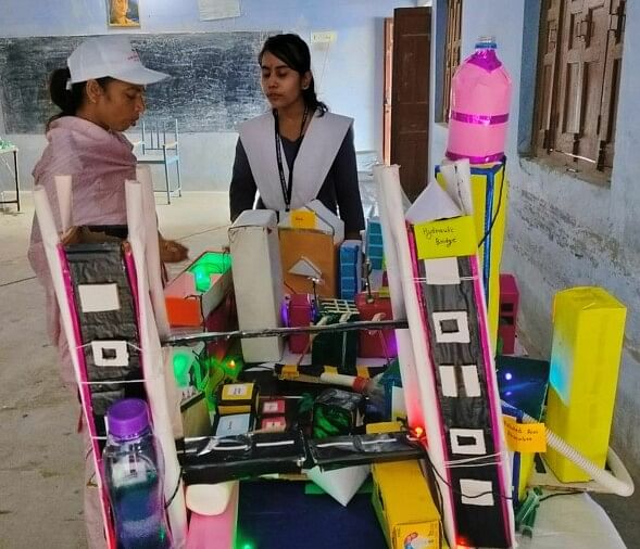 विज्ञान मॉडल के बारे में जानकारी देती छात्रा