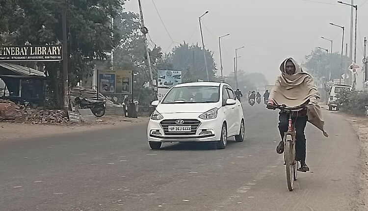 गौरीगंज से गुजरने वाले टांडा-बांदा हाईवे में सोमवार दिन में छाई धुंध के बीच गुजरते लोग ।