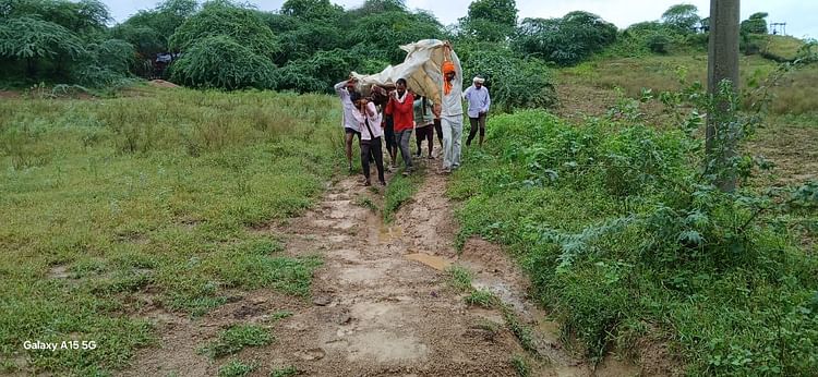 Jalaun News: आटा थाना क्षेत्र में सड़क न होने से परिजन बीमार वृद्ध को चारपाई पर अस्पताल ले जा रही थी। तभी रास्ते में उनकी मौत हो गई। ग्रामीणों ने बताया कि दो दिनों से हो रही झमाझम बारिश से सड़क की तीन फीट ऊंचा पानी बह रहा है।