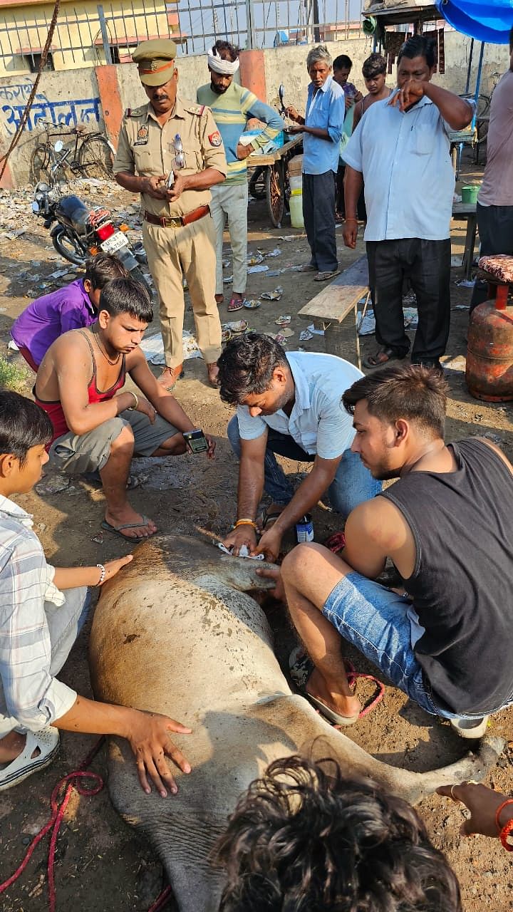 जलेसर में विश्व हिंदू परिषद के कार्यकर्ता घायल गोवंश का उपचार कराते हुए साथ में खड़ी पुलिस
