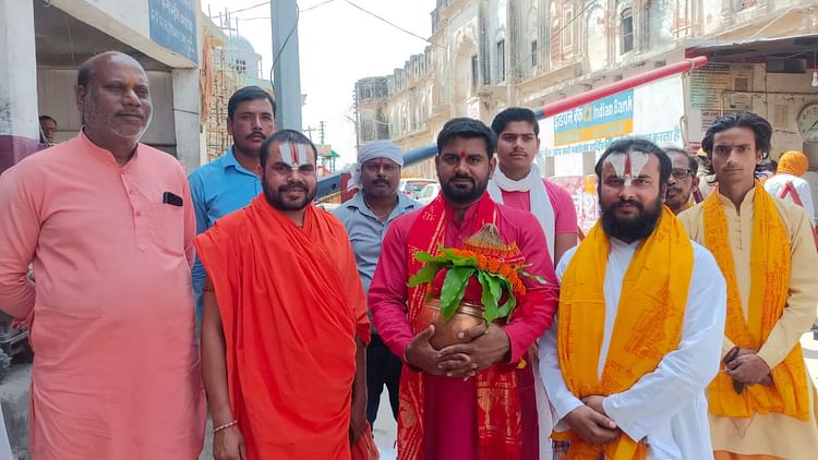 कलश लेकर रंग महल बैरियर पर मौजूद राम जन्मभूमि सेवा समिति के पदाधिकारी