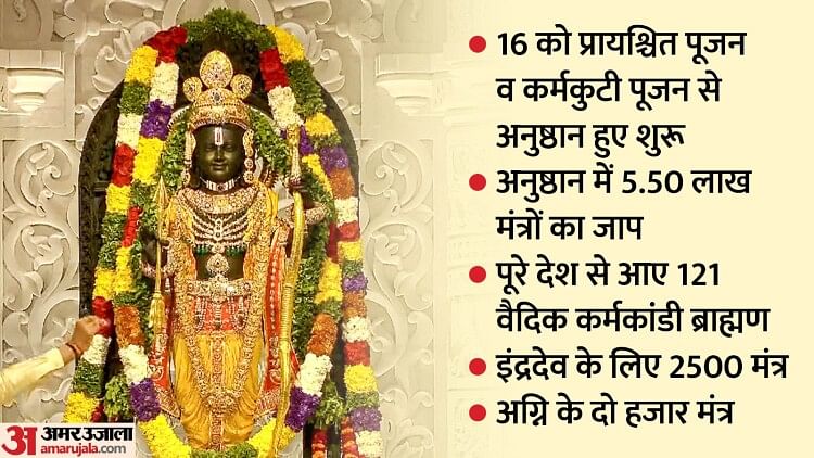 रामलला की प्राण प्रतिष्ठा का अनुष्ठान कई मायनों में अद्भुत रहा। सात दिवसीय अनुष्ठान में 5.50 लाख मंत्रों का जाप रामजन्मभूमि परिसर में किया गया। ये सभी मंत्र रामनगरी के पौराणिक ग्रंथों से लिए गए हैं। पुराण, श्रीमद्भागवत व वाल्मीकि रामायण के मंत्रों का जप हुआ है। काशी समेत पूरे देश से आए 121 वैदिक कर्मकांडी ब्राह्मणों ने इन मंत्रों का वाचन किया।