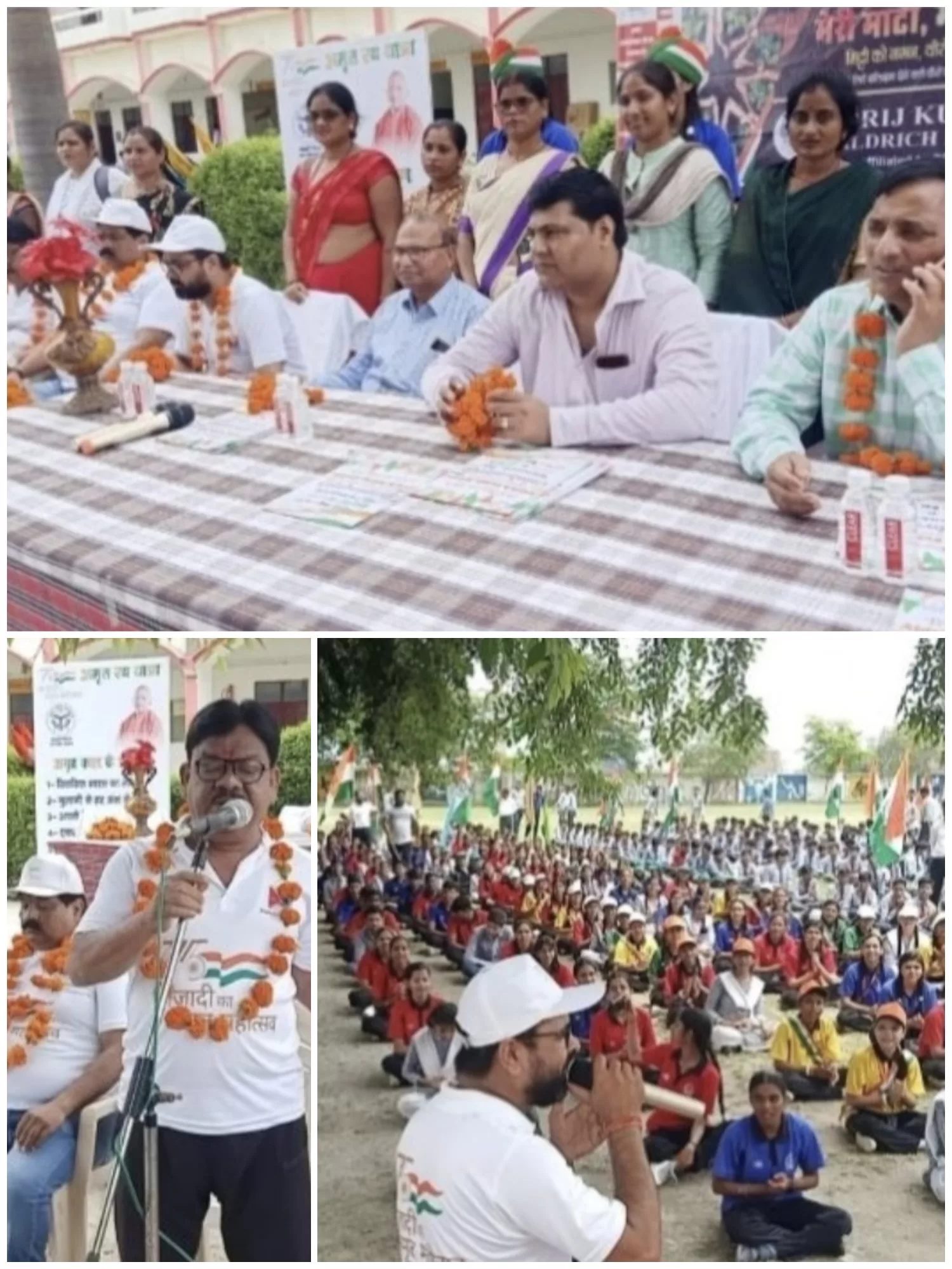 (उरई जालौन) उरई: आज सरकार की निदेशन जिलाधिकारी चाँदनी सिंह के मार्गदर्शन में आजादी के अमृत महोत्सव के अंतर्गत आज जनपद जालौन में मेरी माटी मेरा देश कार्यक्रम के अंतर्गत अमृत रथ यात्रा का आगमन हुआ। जिसका पहला प्रोग्राम बीकेडी पब्लिक स्कूल में अमृत रथयात्रा के अधीन देशभक्ति म्यूजिकल बैंड कार्यक्रम के अंतर्गत देशभक्ति गानों का कलाकारों द्वारा प्रदर्शन किया गया। बीकेडी पब्लिक स्कूल के छात्र छात्राओं व स्कूल प्रबंधक अजय इटोरिया द्वारा भव्य स्वागत किया गया। जिला कृषि अधिकारी गौरव यादव ने अमृत रथ यात्रा के उद्देश्यों पर प्रकाश डाला विकसित भारत का लक्ष्य गुलामी से मुक्ति अपनी विरासत पर गर्व एकता और एकजुटता और नागरिकों में कर्तव्य की भावना उत्पन्न करना ही पंच प्रण है। स्वतंत्रता आंदोलन पर प्रकाश डालते हुए क्रांतिकारियों के सौर्य बलिदान को याद किया।