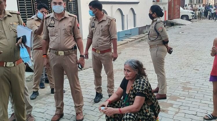घर के बाहर बैठी बुजुर्ग महिला व जांच करते पुलिसकर्मी।