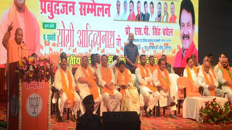 सूरसदन में मुख्यमंत्री योगी आदित्यनाथ का प्रबुद्धजन सम्मेलन को संबोधित करते हुए।