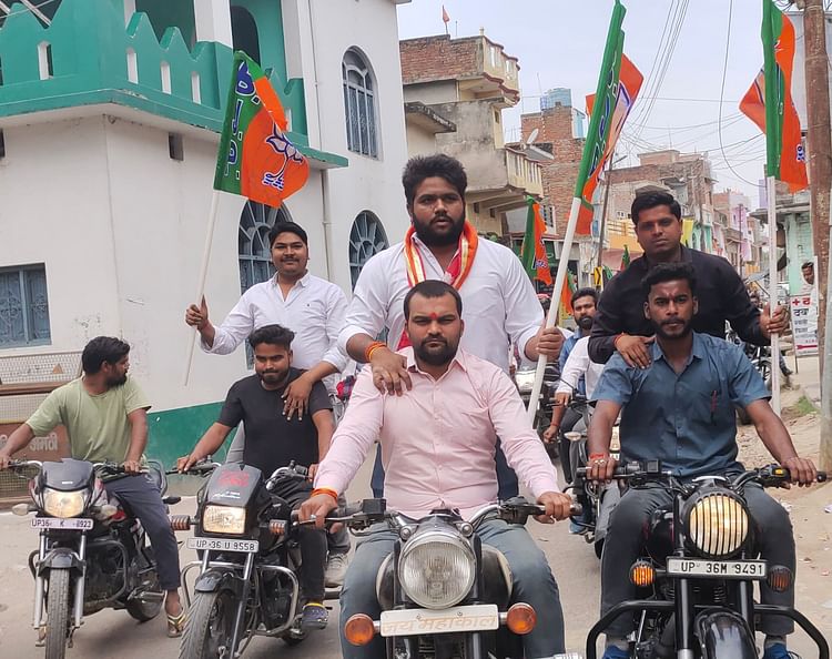 बाइक रैली निकालते भाजपा कार्यकर्ता।