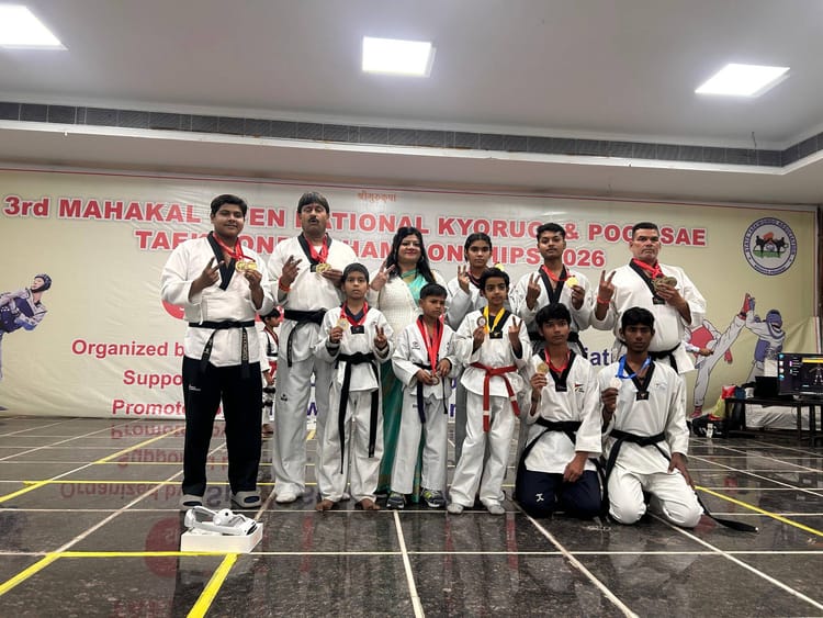 आगरा। उज्जैन के श्रीबालमुकुंद आश्रम के इंडोर हॉल में आयोजित तृतीय महाकाल ओपन राष्ट्रीय ताइक्वांडो प्रतियोगिता में आगरा के खिलाड़ियों ने जिले का गौरव बढ़ाया है। उत्तर प्रदेश की ओर से खेलते हुए ताइक्वांडो मास्टर पंकज शर्मा, संतोष कुमार सिंह, प्रदीप गौर, माधव गौतम, प्रशांत कुशवाह, सुदर्शन देबनाथ, इशांत कुमार और गौरांशी कटारा ने स्वर्ण पदक, जतिन बघेल ने रजत और मितुल ने कांस्य पदक जीते। जिला ताइक्वांडो संघ के अध्यक्ष डॉ. एमसी शर्मा और संगीता शर्मा ने खिलाड़ियों को बधाई दी है।