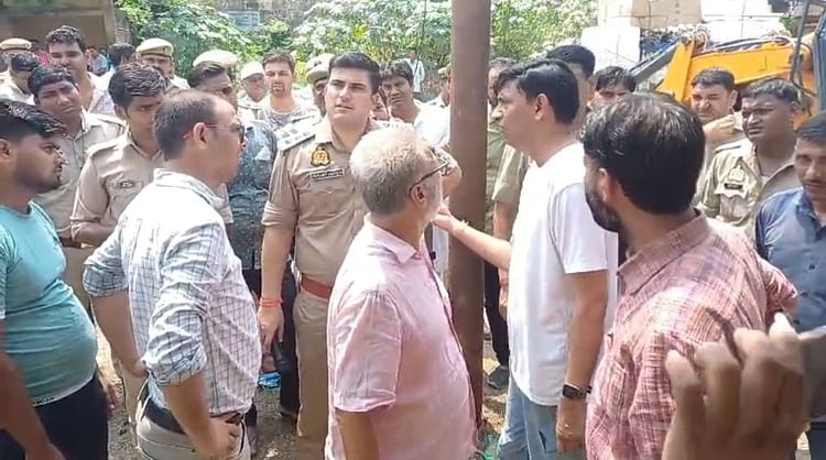 अतिक्रमण हटाने के दौरान पुलिस से नोक झोंक करते अधिवक्ता