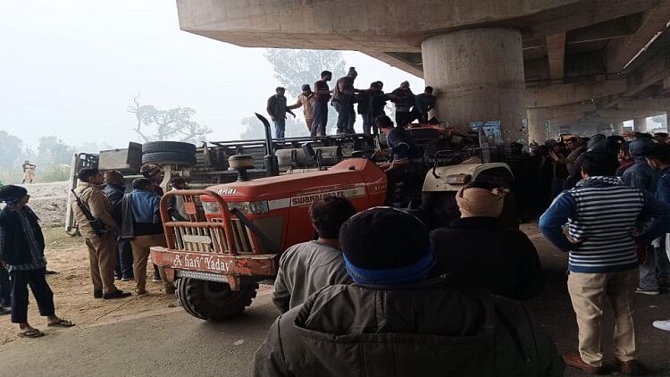 कैंटर में फंसे चालक-परिचालक को बाहर निकालने का प्रयास करते लोग