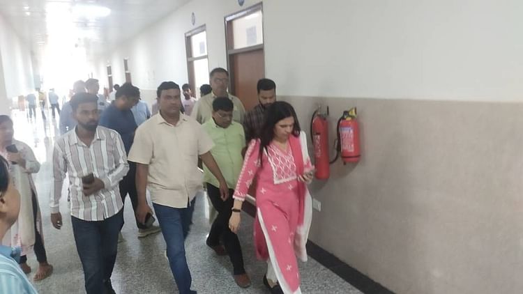 सीबीसी मशीन चोरी होने पर लैब कर्मियों से जानकारी करके लौटतीं प्राचार्य।