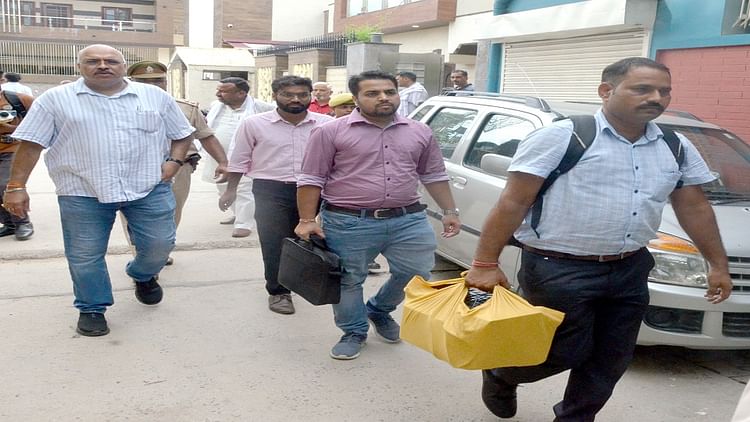 कारोबारी अमित गोयल के घर से जांच के बाद बाहर आते सीबीआई के अधिकारी