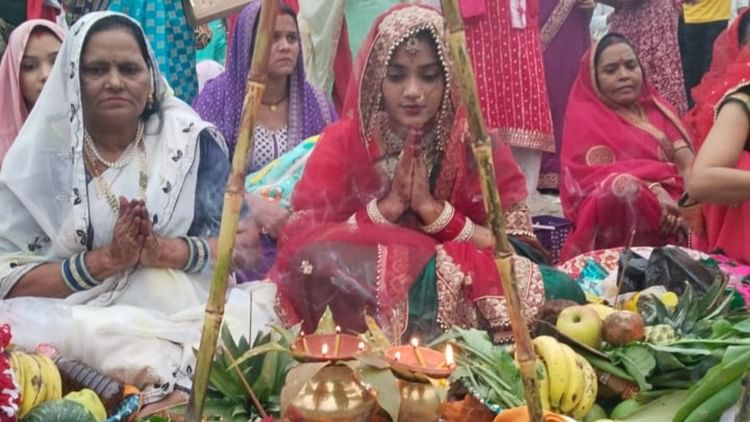 शाहजहांपुर में छठ पूजा करतीं व्रती महिलाएं