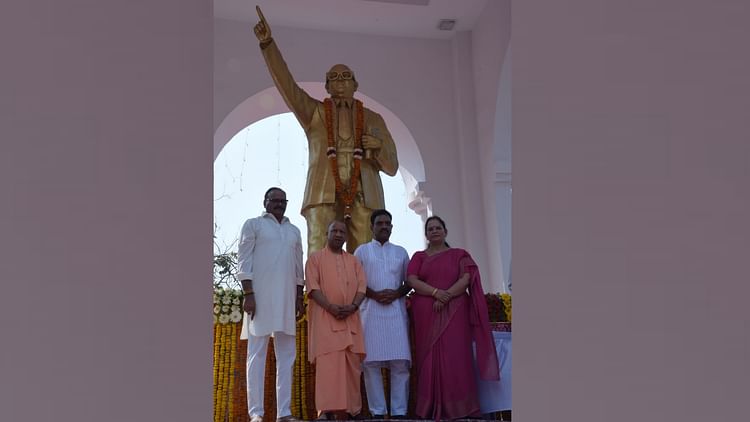 डॉ. आंबेडकर की प्रतिमा पर पुष्पांजलि अर्पित करने के बाद सीएम योगी व अन्य।