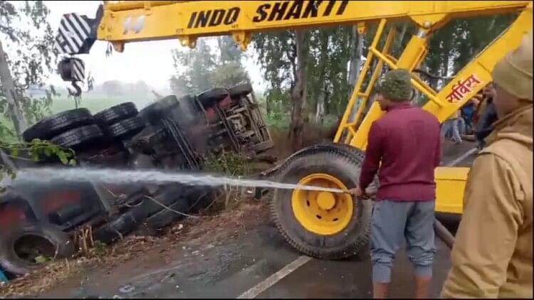 पलटे हुए गैस टैंकर पर पानी का छिड़काव करते दमकल कर्मी