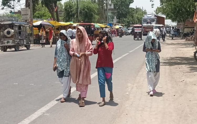 तेज धूप से बचाव के लिए दुपट्टा डालकर निकलतीं युवतियां