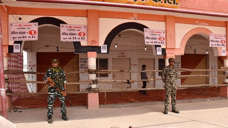 धनीपुर मंडी में ईवीएम की सुरक्षा करते जवान