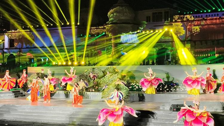 राम की पैड़ी का विहंगम दृश्य, कार्यक्रम की प्रस्तुति देते कलाकार।