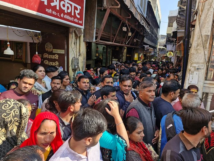 मथुरा। बांकेबिहारी मंदिर के बाहर लगी श्रद्धालुओं की लाइन। – फोटो : mathura