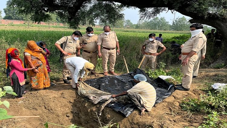 चार महीने बाद शव को जमीन से निकलवाती पुलिस