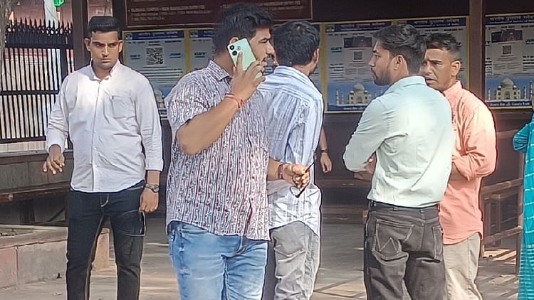 ताज पश्चिमी गेट टिकट घर पर पर्यटकों को गुमराह करते लपके गुलाबी शर्ट और सफेद शर्ट काली पैंट