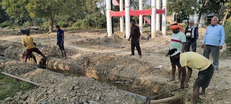 निहालगढ़ रेलवे स्टेशन पर जलापूर्ति के लिए बिछाई जा रही पाइप लाइन ।