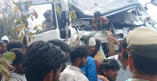 फोटो 2: मुगलपुर नरैनी के पास डंपर में फंसे चालक को निकालते लोग। स्रोत विभाग