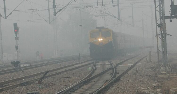 रेलवे लाइन पर छाया कोहरा और गुजरती ट्रेन।