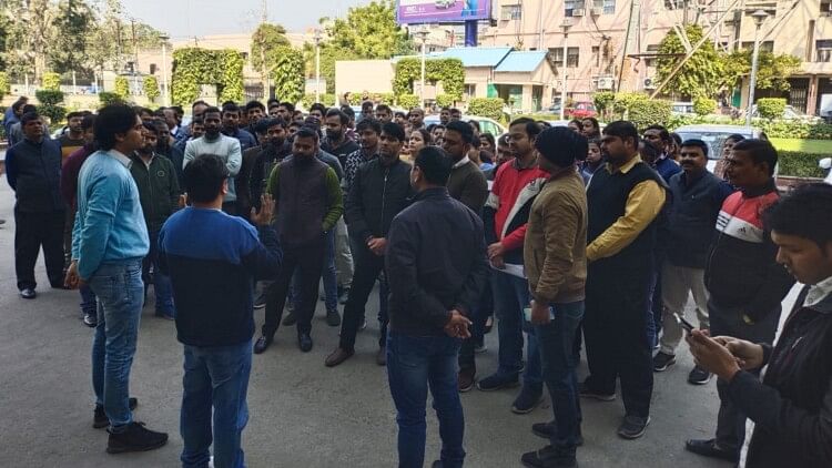 शक्ति भवन में प्रदर्शन करते कर्मचारी।