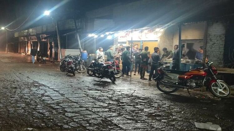 जलेसर मे बारीश से बचने को दुकान पर खड़े राहगीर।