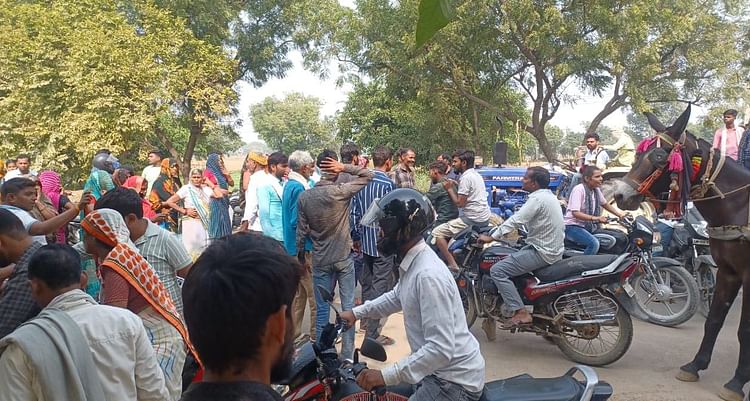 -करहल के मनौना असरोही मार्ग पर डीएपी की किल्लत को लेकर जाम लगाते किसान।