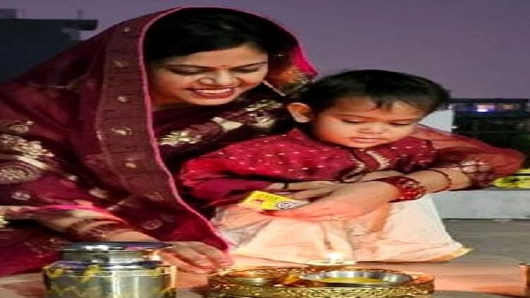 बेटे धैर्य के साथ पूजा करतीं दीक्षा – फोटो : संवाद