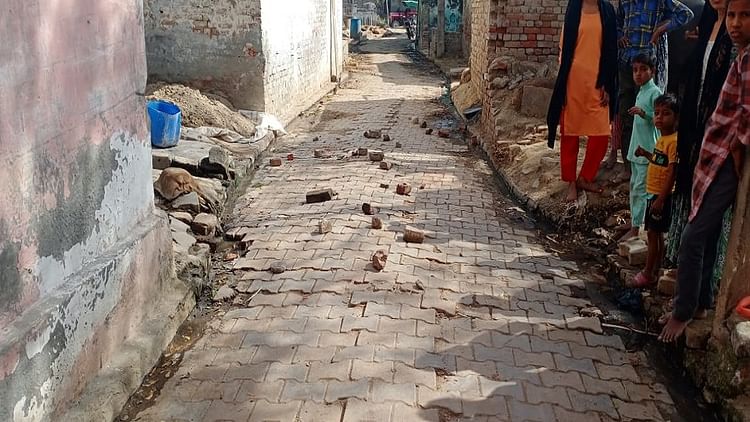 गांव नगला परसू में पथराव के बाद रास्ते पर पड़ी ईंटें