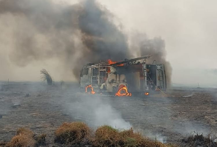 मैदान में आग फैलने से दमकल वाहन भी चपेट में आ गया। सूत्रों का कहना है कि आग के बीच घिरता देखकर चालक ने गाड़ी हटाने की कोशिश की, लेकिन स्टार्ट नहीं हुई। दमकल गाड़ी को जलते देख टीम भाग खड़ी हुई। दमकल वाहन चालक राम प्रवेश राम आग से बुरी तरह झुलस गया। उसे फौरन जिला अस्पताल भेजा गया। खबर मिलने पर एसपी अनूप कुमार सिंह, एएसपी हरेंद्र कुमार सहित अन्य पुलिस व प्रशासनिक अफसर मौके पर पहुंचे।